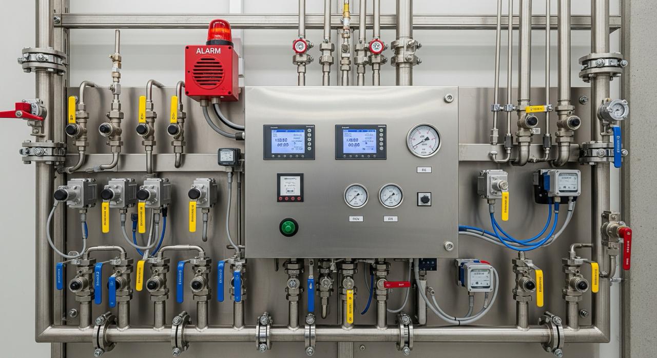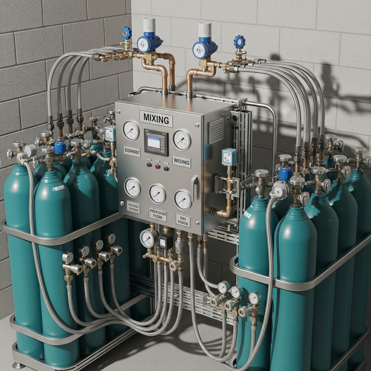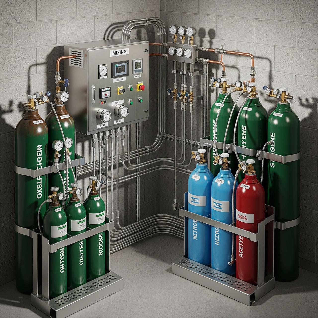 This System/Manifolds comprise a control panel, manifold racks, tailpipes and an isolation valve and a pressure relief valve. Speciality Gases can supply custom made gas specific manifolds for all types of applications for delivering Single pure gas and also Gas Mixtures.